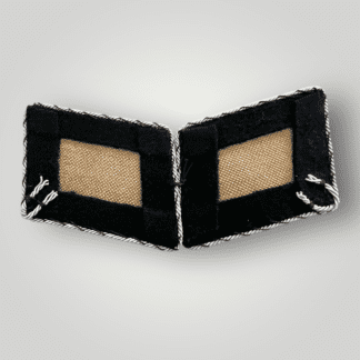 A set of Waffen-SS Haupsturmfuhrer collar boards. The left collar board is hand-embroidered in silver bullion wire with silver twisted braid edging on black doeskin material. The right collar board depicts three silver pips with two silver aluminium wire tresse strips. The reverse of the collar boards has buckram stiffener backing. The Waffen-SS Haupsturmfuhrer collar boards have no damage or repair in good condition.