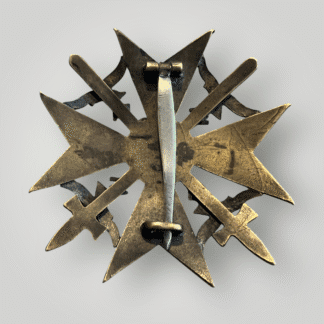 An original German Spanish Cross Bronze with swords, constructed in bronze. The obverse of the decoration depicts a Maltese Cross with pebbled arms. In between the arms are cross swords denoting combat service superimposed by a Luftwaffe style eagle clutching a swastika. The reverse is unmarked its attributed to Petz & Lorenz and comes complete with a barrel style hinge, tapering pin and soldered catch. The Spanish Cross has no damage or repairs with nice patina in very good condition.