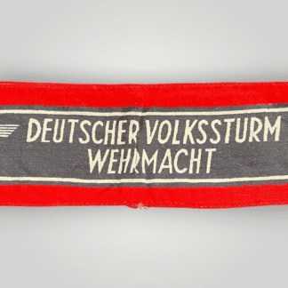 This is an original Deutscher Volkssturm Wehrmacht armband made of screen-printed cotton. It features a central black band with white lettering and Wehrmacht Eagles, bordered by two white lines and red edges. Civilians wore this armband when fighting with the military from October 1944 to the end of the war in 1945. The armband has no damage or repairs in good condition.