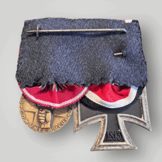 A German WW2 Iron Cross & Finnish Cross Court Mounted, with Ribbon Bar. This court mounted medal group is seldom encountered together. The first medal is a German WWII Iron Cross 2nd Class, unmarked with magnetic iron core. The accompanying medal is the Finnish Cross of Liberty 4th Class with swords, a striking decoration awarded for military merit during conflict, dated 1941 on the reverse. Both medals are expertly court mounted, enhancing their display and preserving their historical integrity. Completing this ensemble is a medal ribbon trio, prominently featuring the Winter War 1939-1940 Medal, a tribute to those who served in Finland’s fierce struggle. This medal is not part of the medal group. The condition of the medals are fair with some minor oxidisation.
