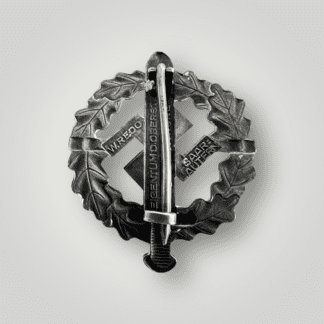 An original SA Sports Badge Silver By W.Redo (SA Sportabzeichen in Silber). Constructed in silvered steel. The obverse depicts a circular oak-leaf wreath, overlaid by a central sword and canted swastika. The reverse of the swastika is stamped with the maker’s mark Werner Redo, Saarlautern, complete with vertical pinback measuring 46.30 mm (w) x 58.84 mm (h), in mint condition.