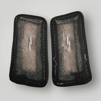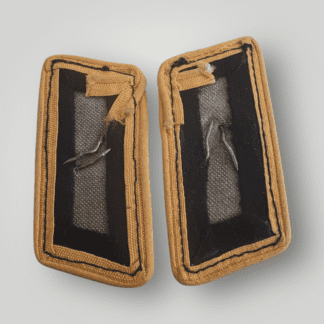 A rare set of German WW2 Heer Panzer-Aufklärung ‘Reconnaissance’ collar tabs, made from black wool with golden yellow piping and aluminium skulls. The reverse features buckram backing with intact prongs. Worn by Armoured Reconnaissance troops, these mint condition tabs are exceptional and would be difficult to upgrade.
