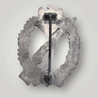 A nice example of an Infantry Assault Badge Silver, constructed in zinc. The reverse has a pillow crimp variant, due to the set of the hinge and catch by an unknown maker yet, in good condition.
