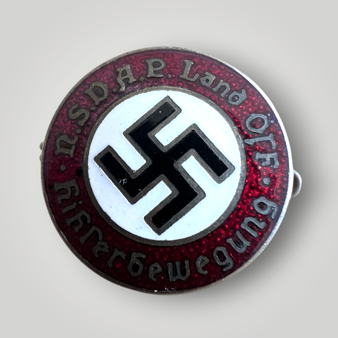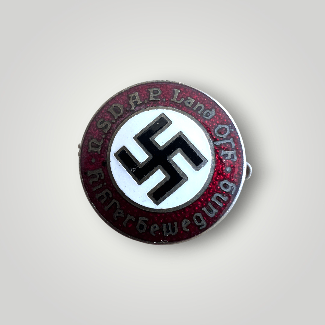 A very early Austrian NSDAP Hitlerbewegung party membership badge, constructed in red, white, black, and gold enamel. The obverse of the NSDAP pin has nice enamelwork with the lettering “NSDAP Land Öst.”Hitlerbewegun” (NSDAP Country Eastern, Hitler Movement). The reverse of the badge has no RZM code, but is marked ‘Gesh & Gesch’ with with an encircled ‘B’. This party badge was issued between the late 1920s and 1934 and this was prohibited to wear after 1934. The scarce pin has no damage or repairs and the enamel is free from cracks, in very good condition.