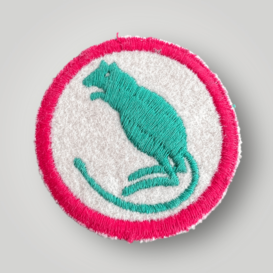 An orginal British WW2 7th Armoured Brigade formation badge, machine embroiderd. The insignia depicts a jerboa (desert rat) in green with white eye, tail curled below, on a white circle with a red border. The reverse of the badge has a hessian style backinh with no damage or repairs in good condition.