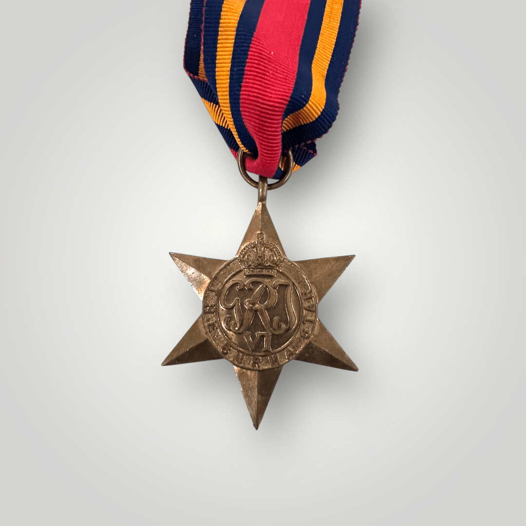 An original British WW2 Burma Star campaign medal, constructed in brass die-struck. The medal depicts a six point star with ‘GRI’ with ‘VI’ in the centre, which is the monogram for ‘King George VI’ surrounded by concentric circles with the inscription ‘The Burma Star’ surmounted by Kings Crown, complete with original ribbon. The medal has no damage or repairs in good condition.
