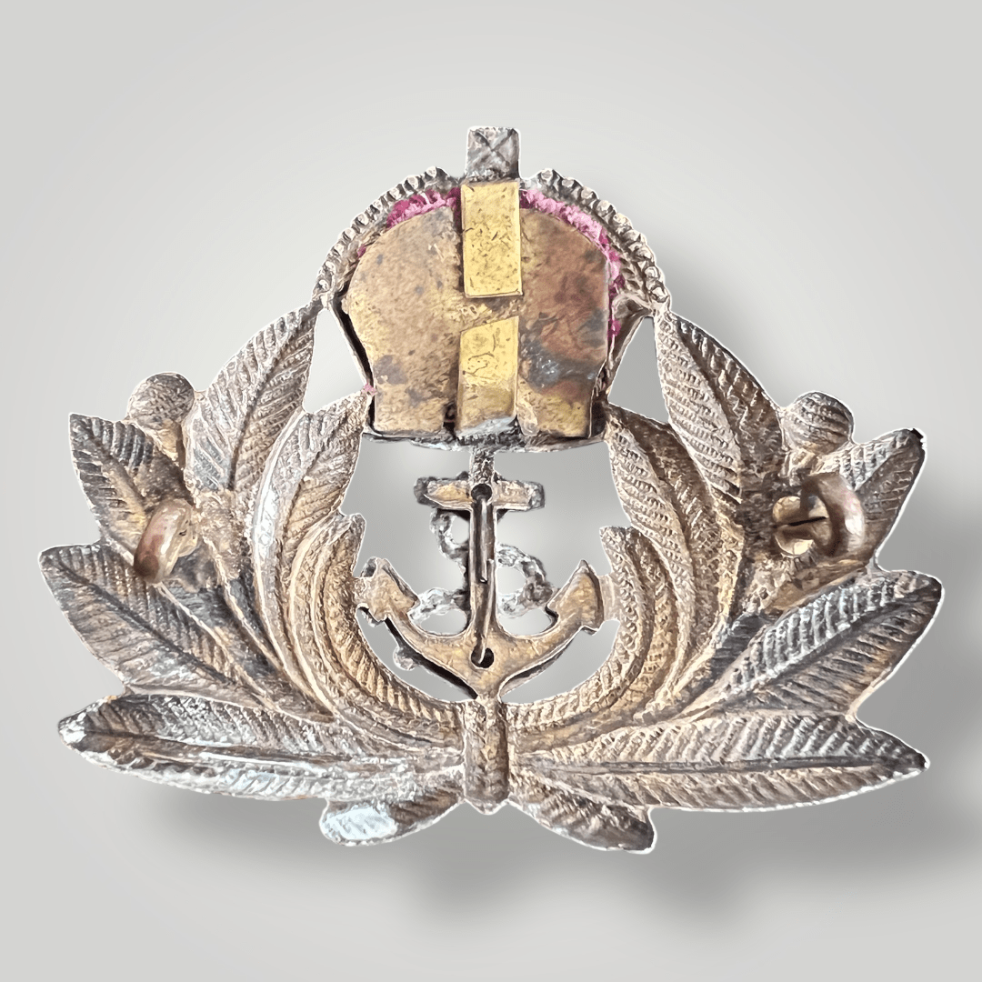 An original British WW2 Royal Navy Officers cap badge, constructed ub brass and white metal with felt backing. The badge depicts a silver anchor, with a wrapped cable, surrounded by gold laurel leaves surmounted by a padded velvet King’s crown, with red, blue, and green stones embedded. The reverse is unmarked in very good condition.