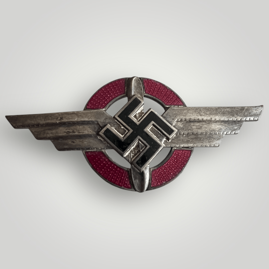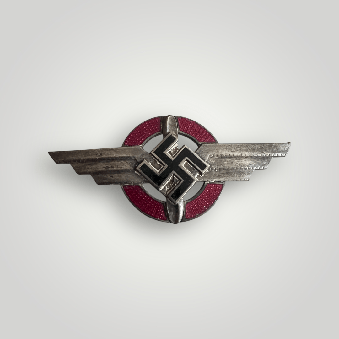 A DLV (German Air Sports Association) cap badge by Deumer, constructed in enamel. The badge depicts a pair of stylised horizontal three-pinion wings supporting a vertical two-bladed propeller, all in white metal, over the centre of which imposed a black enamel swastiks with gilt metal edges, with a red enamel ring on the outer rim. The reverse is marked ‘Wilh, Deumer, Ludenscheid’ and ‘GES. GESCH’ complete with both prongs.