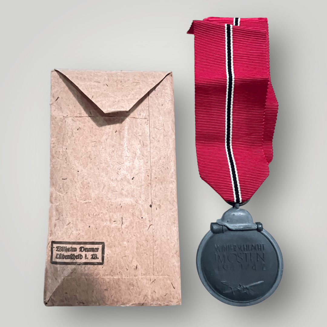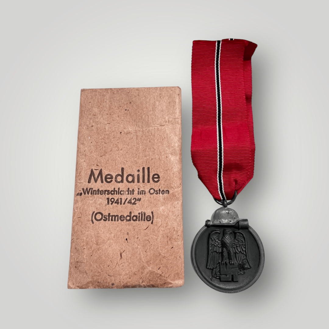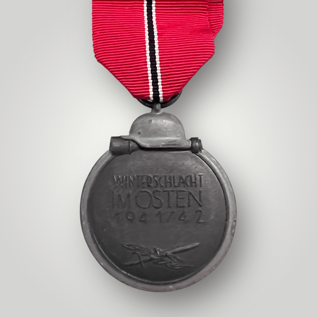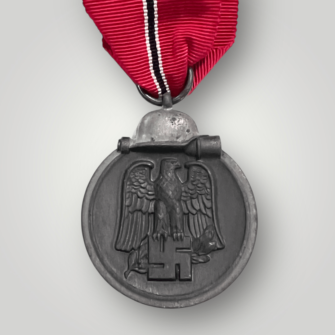 The Eastern Medal was instituted on 26th May 1942 was commonly known as the Ostmedaille (East Medal) or Russian Front Medal, which is generally made from zinc and typically measures 44mm x 36mm with gunmetal finish. The medal depicts a national socialist eagle grasping a swastika with laurel leaf behind surmounted by a German helmet and stick grenade attached to the medal loop. The reverse features the text in capital letters: “WINTERSCHLACHT IM OSTEN 1941/42” (“Winter Battle in the East 1941-42”) featuring a crossed sword and branch below the text.