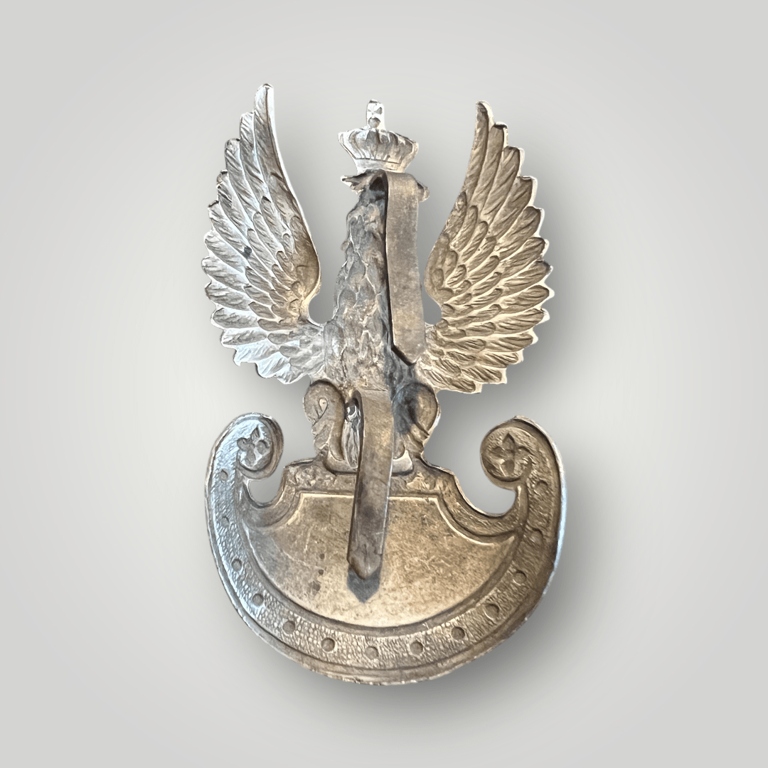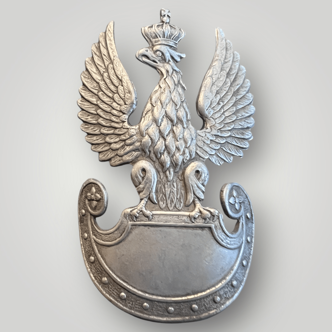 A Free Polish Forces (Army In Exile) cap badge, worn by enlisted men/ncos constructed in white metal. The badge illustrates the National Crowned Eagle with spread wings perched on heraldic sheild. The reverse of the insignia has both prongs intact in very good condition.