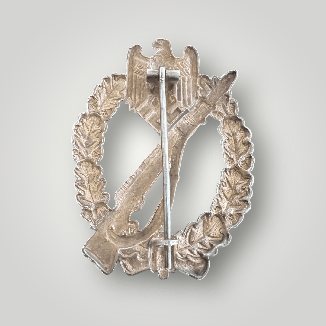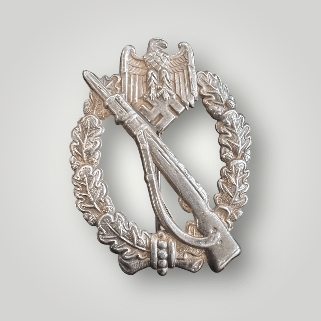 An original German WW2 Infantry Assault Badge Silver by Otto Shickle combat award, constructed in tombac silver plated. The badge features an oval-shaped wreath of oak leaves, surmounted by the German national eagle clutching a swastika, with a rifle and fixed bayonet crossing the centre of the badge. The reverse of the Infantry Assualt Badge is hollow with a classic barrel hinge, vertical pin assembley and a flat wire catch attributed to the desirable maker Otto Shickle. A very nice rare badge in good condition.