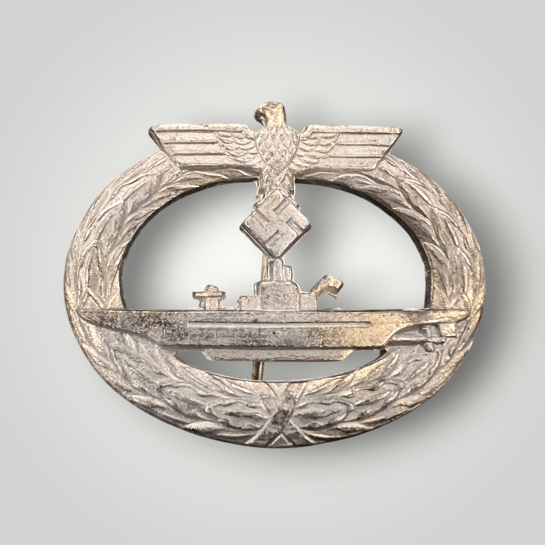 The WW2 badge depicts a submarine in the centre surrounded by an oval laurel wreath with a German Eagle above clasping a swastika, gilded in gold which was worn on the lower left of the uniform.