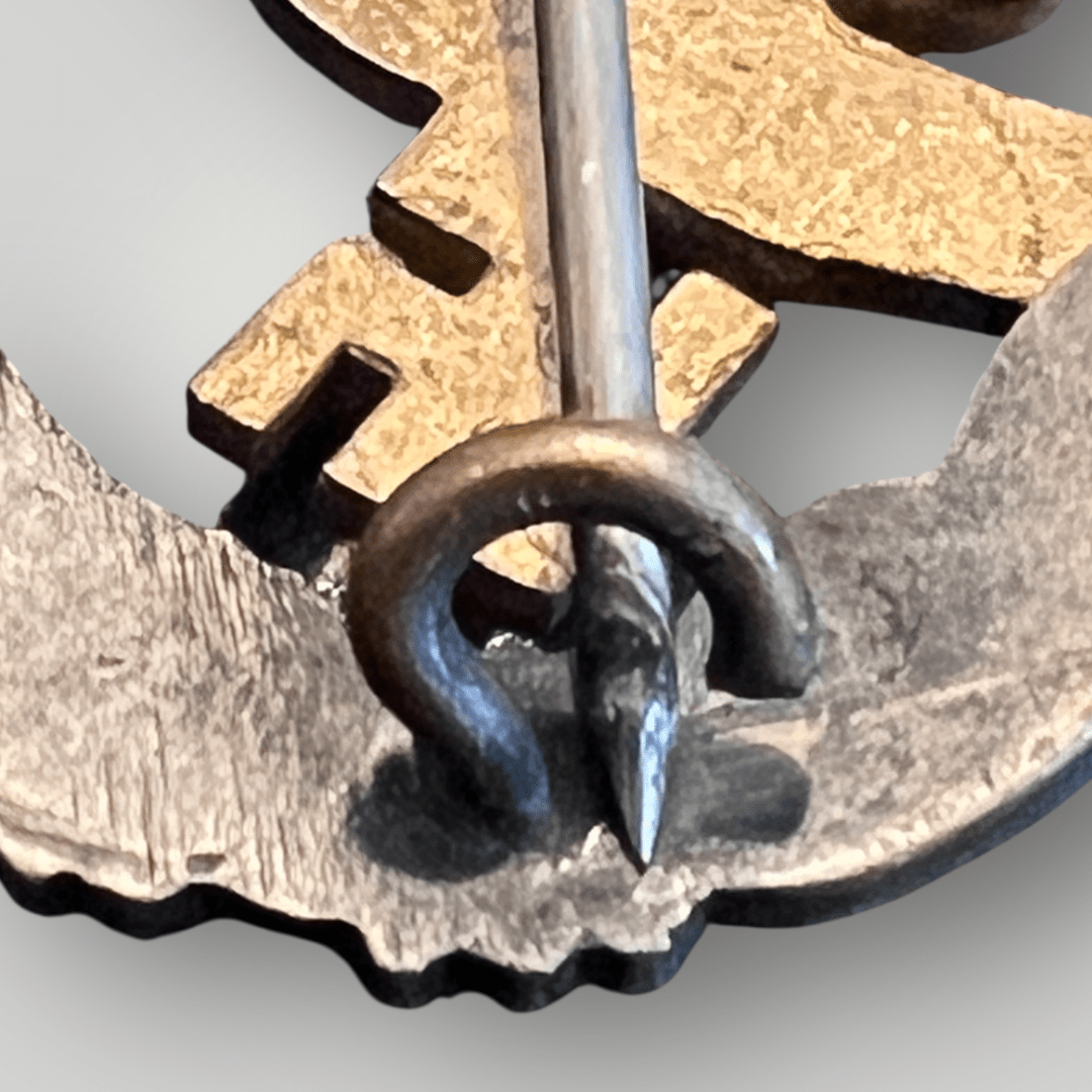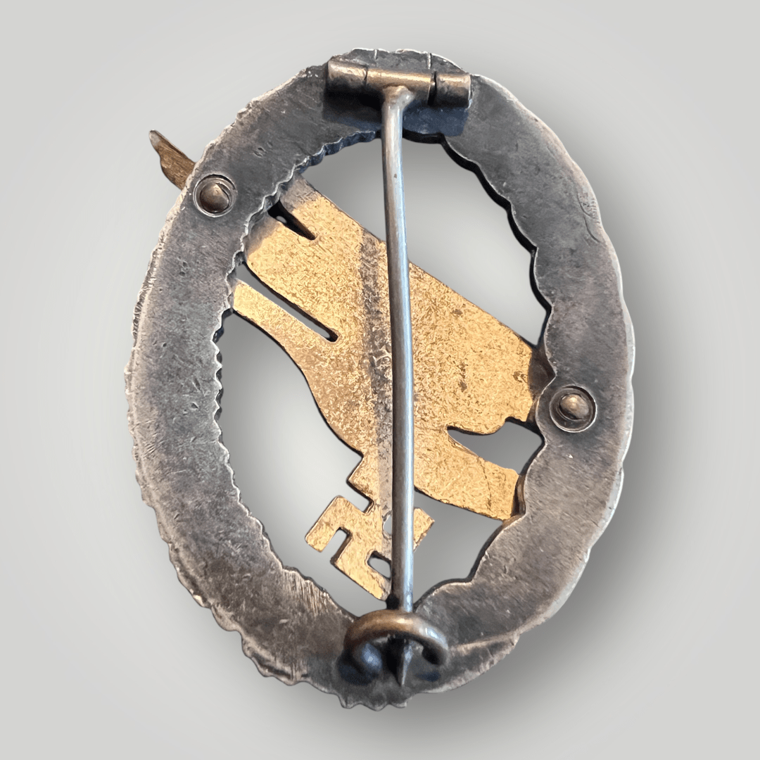 The Fallschirmjäger Badge (Fallschirmschützenabzeichen) was a badge awarded to qualified parachutists of the Wehrmacht and the Waffen-SS of Nazi Germany. The badge was first established by order of Hermann Göring on 5 November 1936. It was originally awarded to Luftwaffe personnel after completion of the required number of six jumps. The badge depicted a diving eagle with a swastika in its claws surrounded by a silver wreath. The original construction was made of gold-finished bronze for the eagle and “oxidized silver plate” for the laurel leaves. In 1937, the construction of the badge changed to aluminum. In late 1942, the construction was changed again to a metal alloy. A cloth version of the badge was also authorized in 1937, to be worn on a flight jacket. A recipient had to re-qualify for the badge each year.