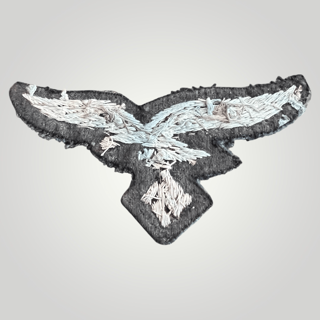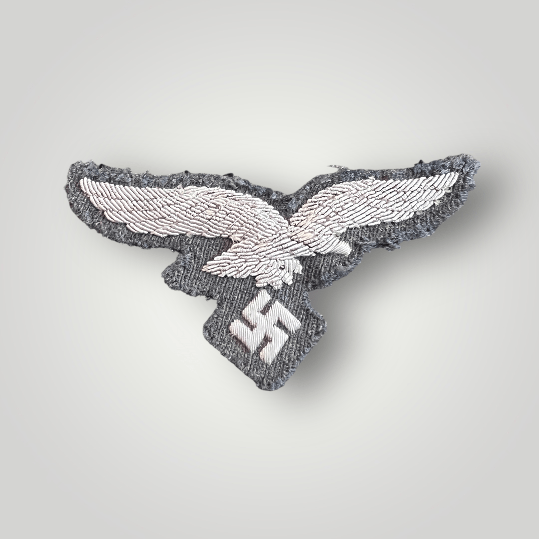 Original WW2 Luftwaffe Officer’s Breast Eagle. This version is hand embroidered in silver bullion on blue-grey cloth, with minor wear otherwise in good condition.