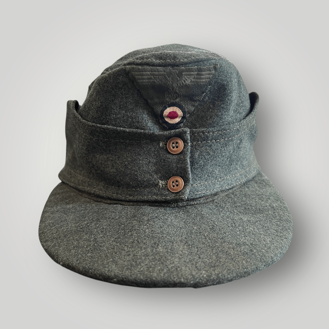 An orginal WW2 German Heer M43 Officers field cap, constructed in grey field grey wool with aluminium wire piping running around the top of the outer edge of the crown, with two pebbled and grey-painted zink buttons. The front of the M43 cap has a typical flat wire bevo trapezoid insignia factory applied. The interior of the M43 cap has a silver grey rayon liner stamped size 57 in black ink, with a partial brown leather sweatband across the forehead. The cap has light sweat stains in the liner with no damage or repairs otherwise in good condition.