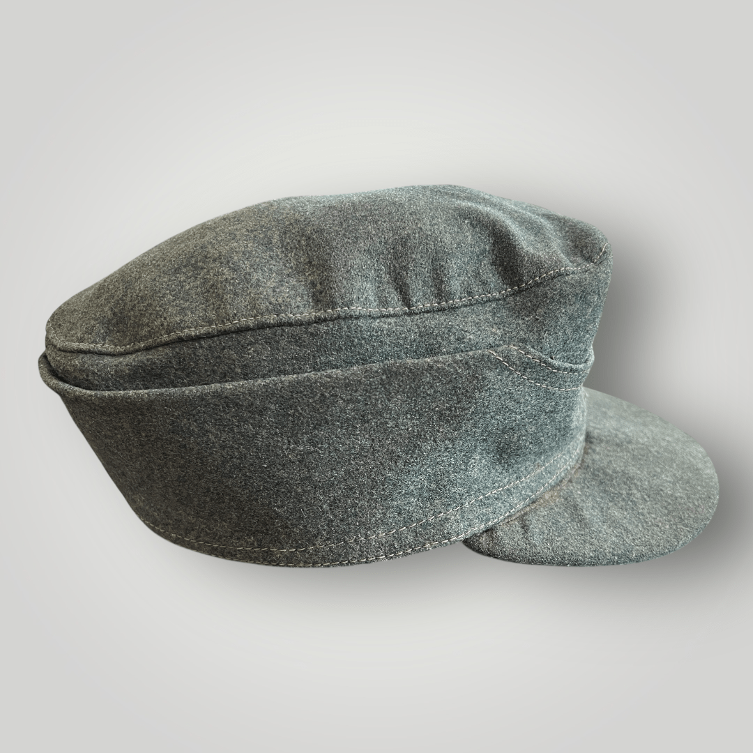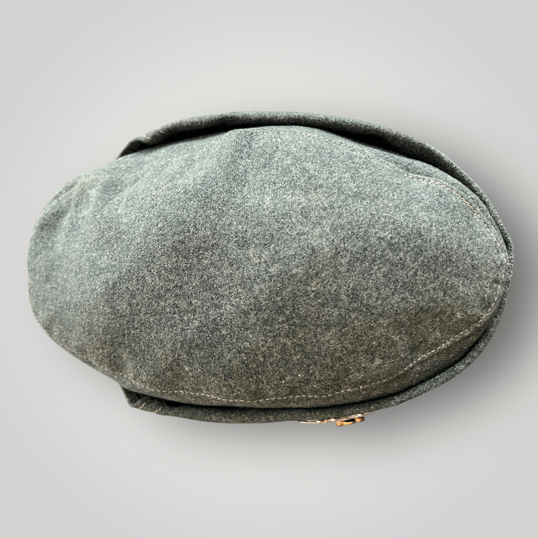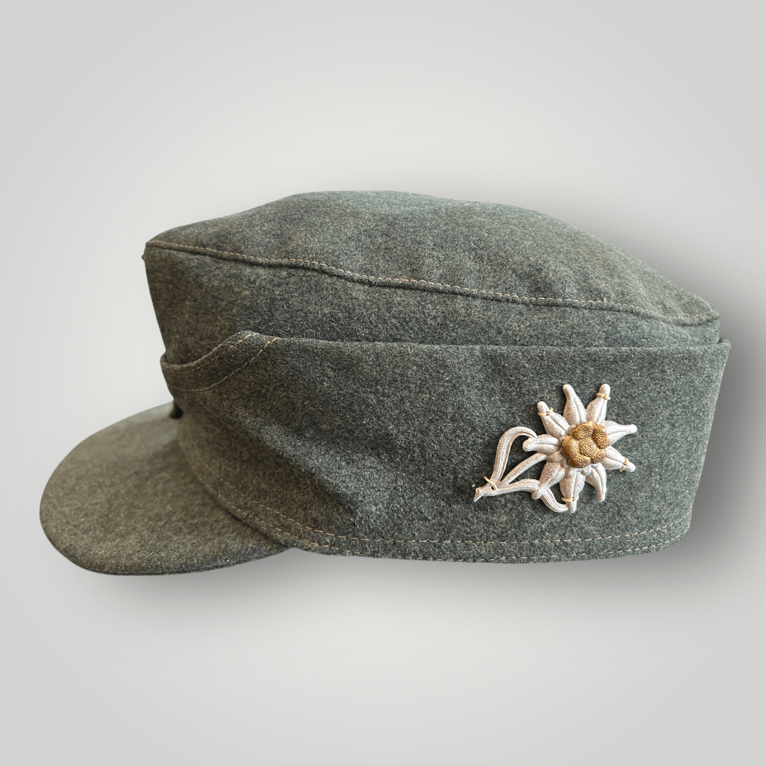 This M43 Heer Gebirgsjäger Cap is a late-war field cap design and retain all of its original components. The exterior is constructed from mid-war Feldgrau wool, which is relatively coarse and notably free from any moth holes or damage. The front features a standard Bevo machine-woven trapezoid insignia, securely affixed with straight machine stitching. Additionally, the cap includes two brown Bakelite buttons. The side is adorned with a zinc Edelweiss, complete with a steel pestle, properly sewn in place. The interior is unmarked and finished with a high-quality cotton satin lining and an intact brown leather sweatband. Overall, the cap displays no nicks or damage and, aside from light signs of wear, is in excellent condition.