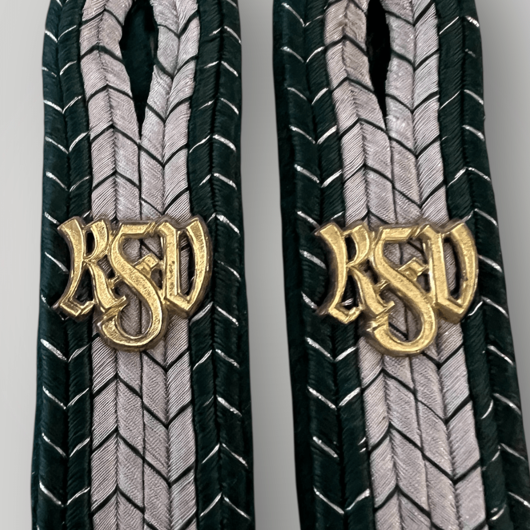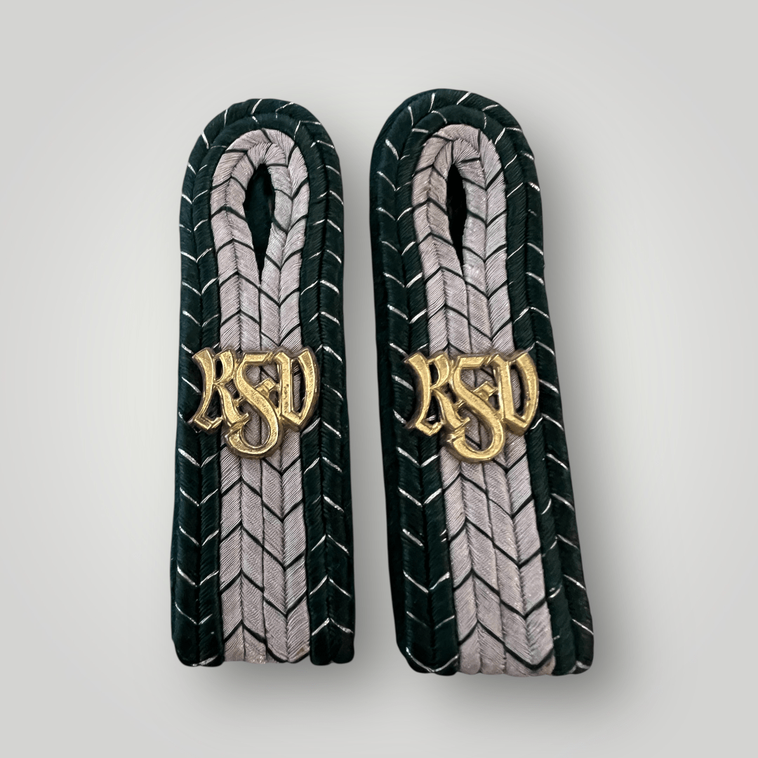 A set of Third Reich Customs Officials Shoulder Boards (Reichsfinanzdienst Zollgrenzschutz) for the rank of customs operations assistant equivalant to the rank of Feldwebel. The shoulder boards are silver in the centre bordered with green braid thread with silver chevrons with complete with gold metal cyphers ‘RZD’ for Reichsfinanzdienst Zollgrenzschutz (Reich Finance Administration, Customs Border Protection). The shoulder boards are complete with slip on tongues with no damage or repairs in condition.