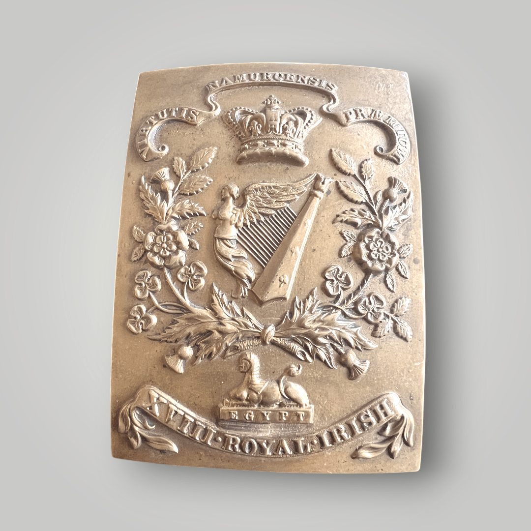 The 18th Royal Irish Regiment, also known as the Royal Irish Regiment of Foot, was founded in 1684 and served with distinction in numerous campaigns throughout British military history. Renowned for its bravery, the regiment played key roles in conflicts such as the War of Spanish Succession, the Napoleonic Wars, and the Crimean War. The regiment earned a reputation for exceptional discipline and courage, often being deployed in challenging theatres where their steadfastness under fire proved invaluable. Throughout the eighteenth and nineteenth centuries, the 18th Royal Irish Regiment became synonymous with Irish martial spirit and loyalty to the Crown, attracting recruits from across Ireland who sought adventure and honour in service. Their distinctive regalia, including the ornate cross belt plate buckle featuring symbols like the Celtic Harp and Victorian Crown, reflected both their heritage and their proud traditions.