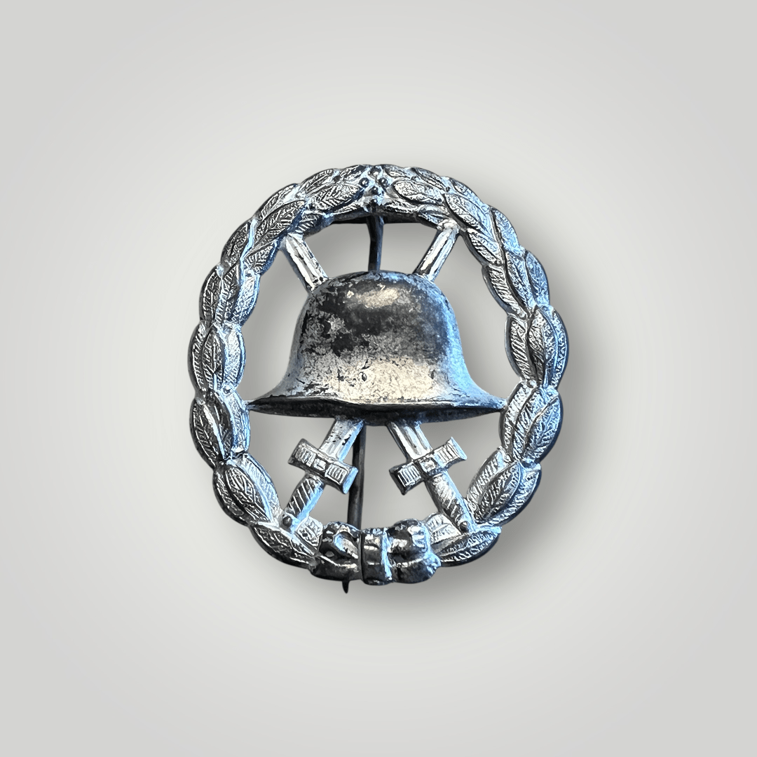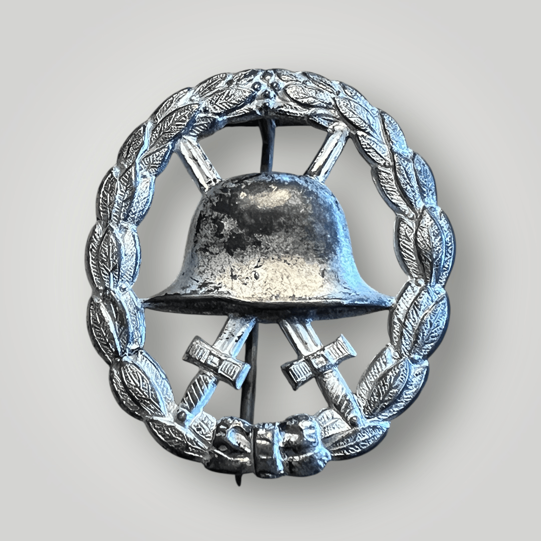 An original WW1 Prussian Wound Badge in silver voided version by Schickle, die-stamped hollow back construction, with the majority of the silver finish intact with a nice patina. The decorations depicts a oval oak leaf wreath with a stanhelm in the centre with cross swords. The reverse has crimped hinge and flat wire catch, with no damage or repairs in good condition.